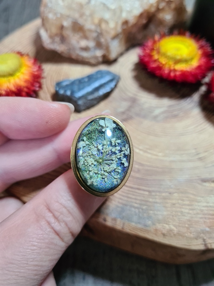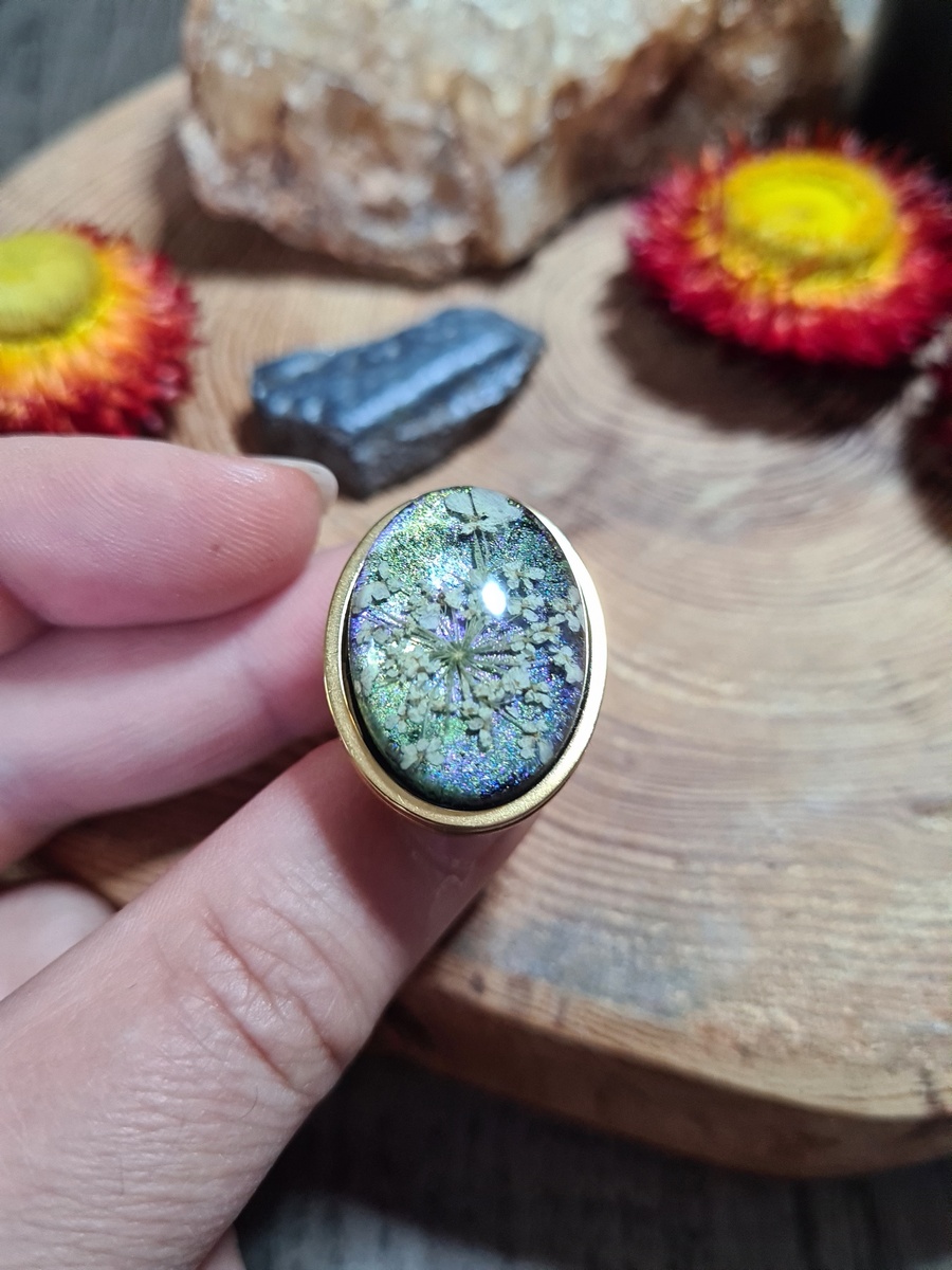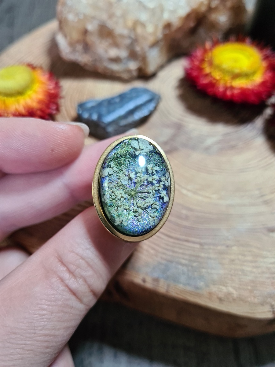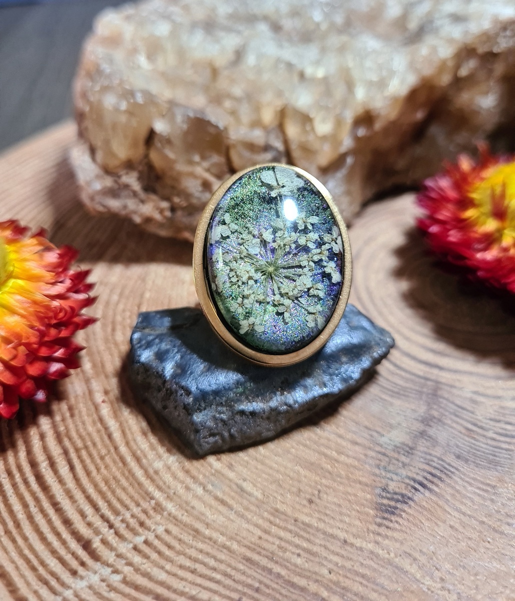 Pierścionek z żywicy z kwiatem dzikiej marchewki
